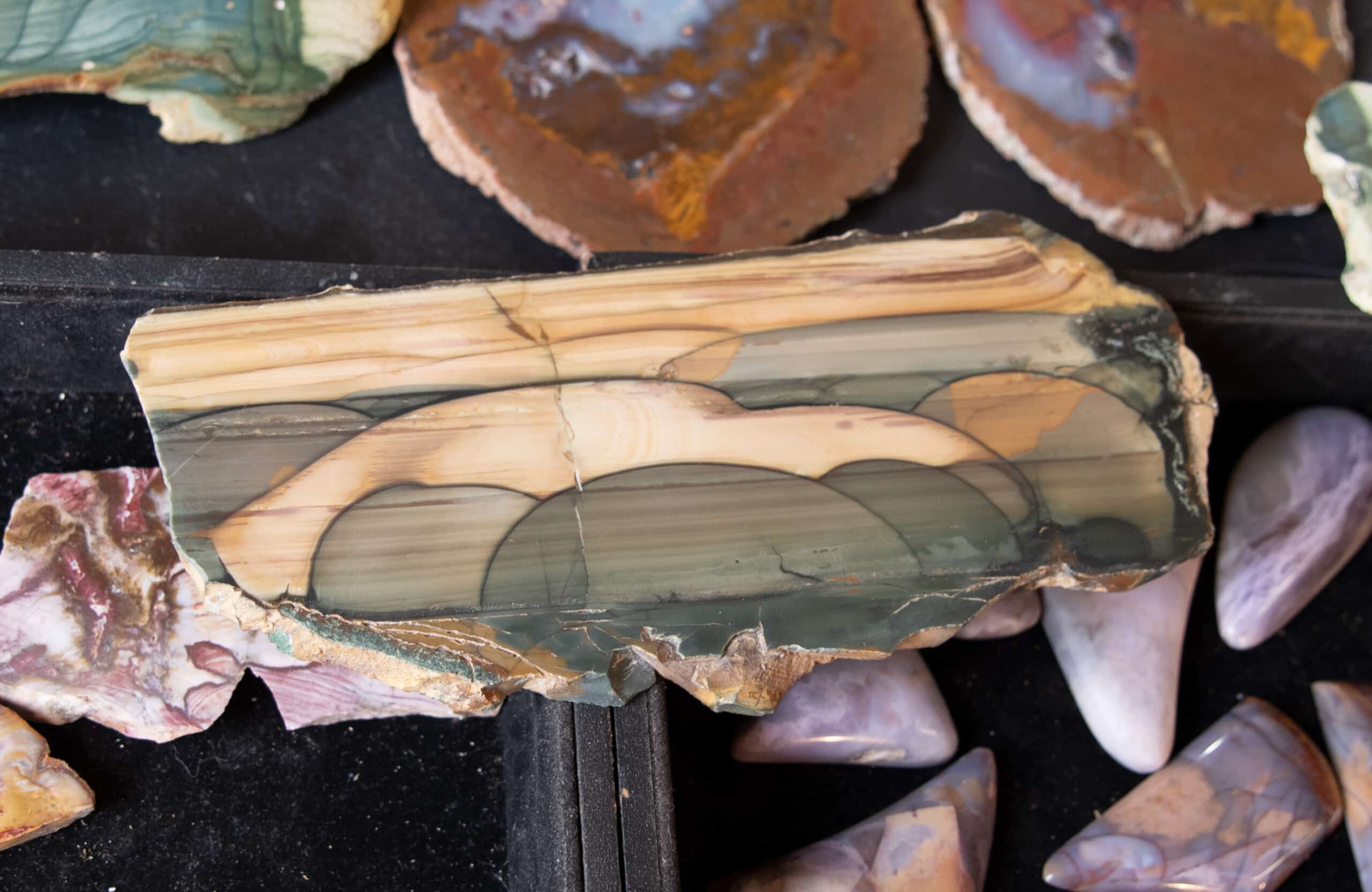 Kemp arrayed a bevy of exotic stones in a shallow wooden box lined with black velvet on the rock shop counter.