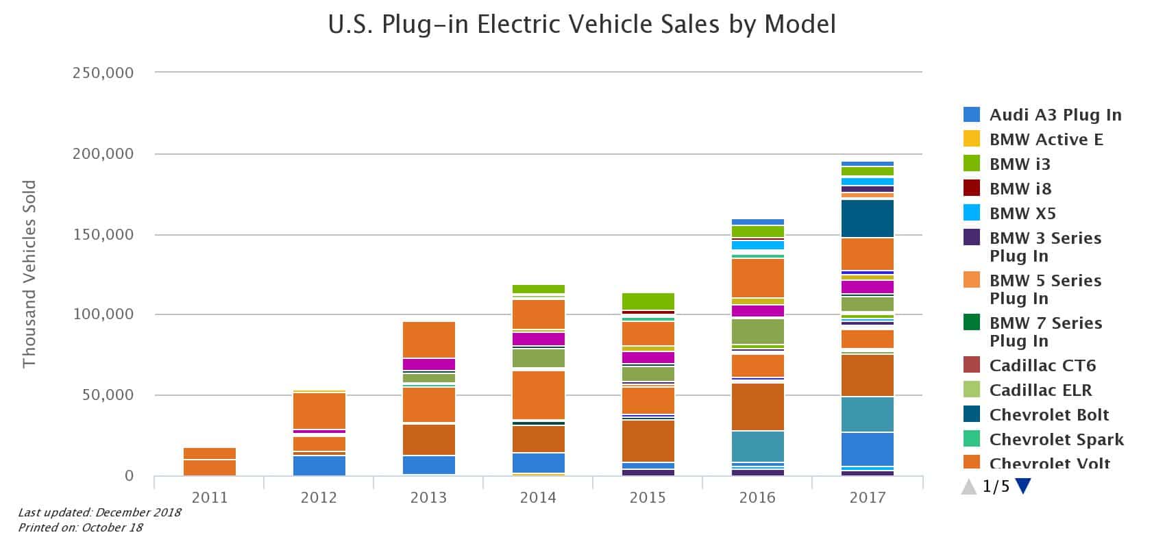 Sales of plug-in electric vehicles (PEVs) grew rapidly from 2011 to a record high in 2017. Technology improvements, cost reduction, increasing model choice, maturing charging infrastructure, and economic recovery have continued to influence and support increased sales. Through 2017, the Chevrolet Volt (electric/gas) has been available on the market the longest and maintains the largest overall sales. In 2017, the Tesla Model S was the best-selling plug-in electric vehicle, followed by the Chevrolet Bolt (all electric) and the Tesla Model X – image – US Department of Energy