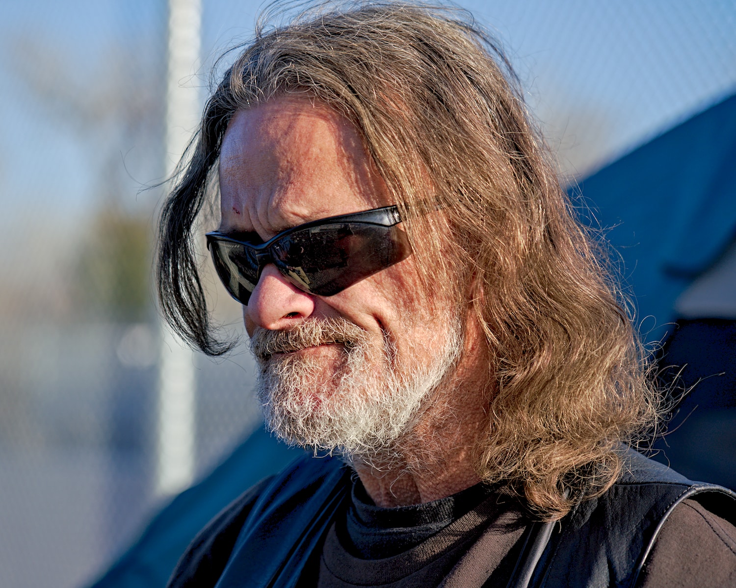 Next to Mamma Bear’s camp, a tall, thin man stoops to emerge from a six-person tent packed with belongings. His graying hair is long and straight and parted in the middle. Large sunglasses cover half his face. He’s entirely dressed in black. His bare finger tips protrude from black bicycle gloves, thumbs tucked into his belt. In-between his hands, the handles of four knives extend up from the waist of his jeans. Under a black leather vest, the word SECURITY is emblazoned in stark white capital letters across a black t-shirt.