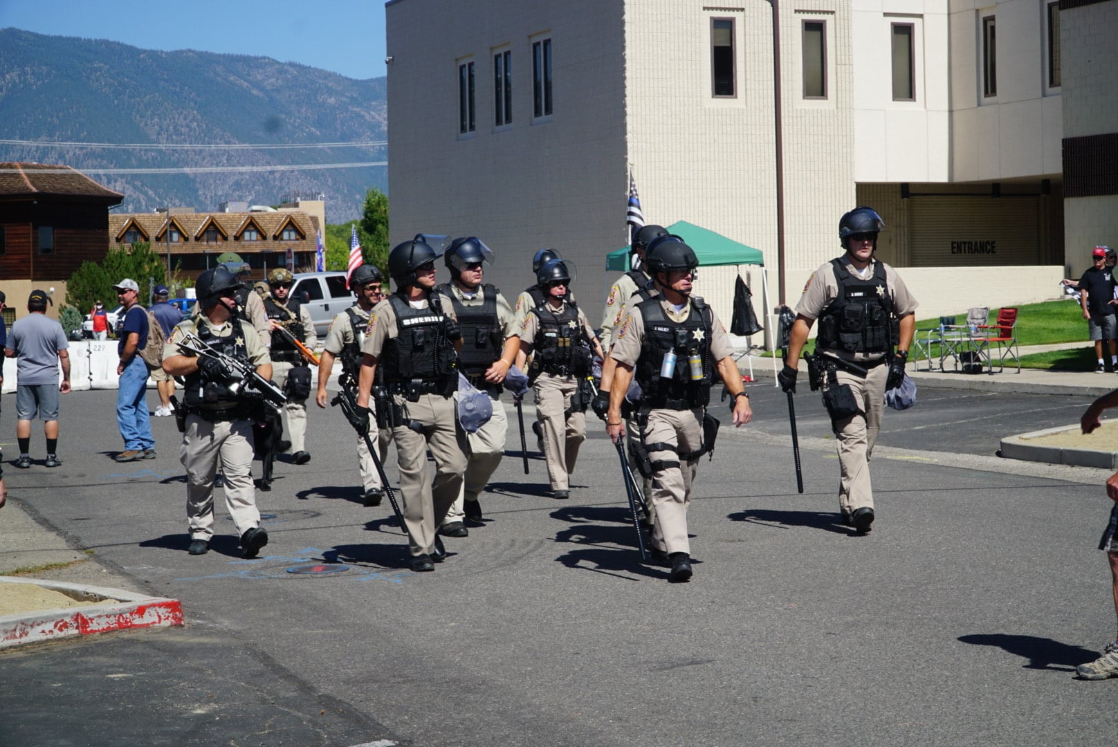 I crossed Highway 395 at the crosswalk where DCSO deputies clad in riot gear were managing Blue Lives Matter pedestrians. They used their batons to signal for people to cross and when to let cars go past on busy Main Street.