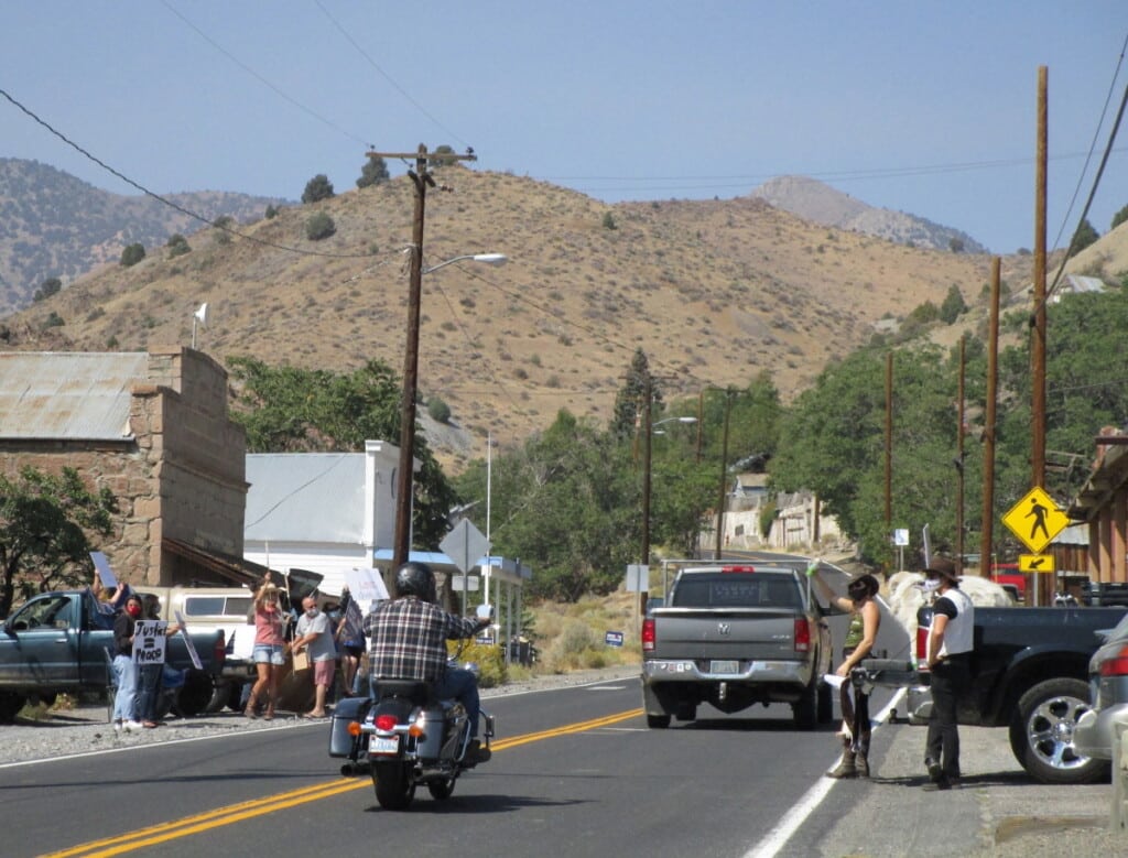 Silver City’s main drag is usually busy with tourists heading to Virginia City on Saturdays, and this day was no different. About 20 percent of those passing through and seeing the signs either looked straight ahead and ignored the scene, or stared in bemusement. About 30 percent of those driving through gave the demonstrators a thumbs down or a disapproving shake of the head.