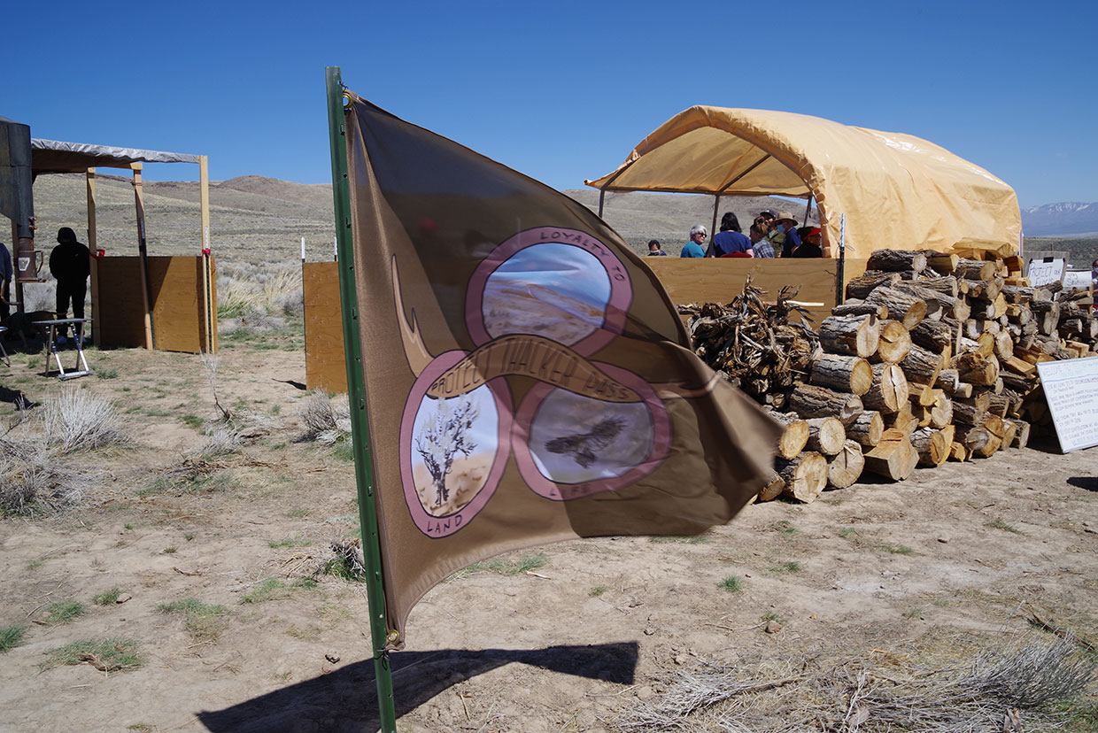 A protect Thacker Pass flag waves on April 10, 2021 while Native Americans from across the region meet to share a meal and show opposition to the proposed lithium mine – photo: Brian Bahouth/the Ally