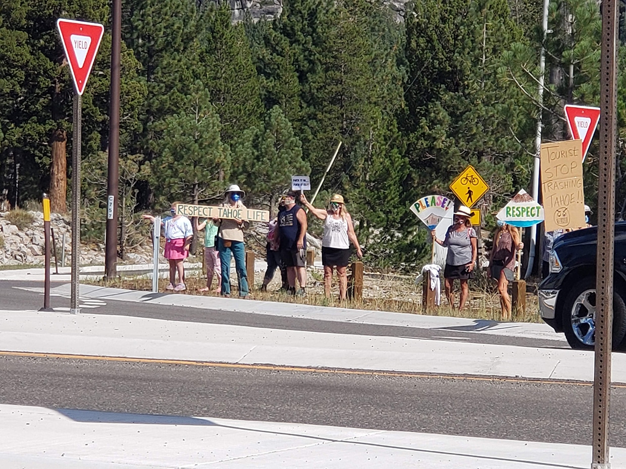 In August of 2020, several Lake Tahoe residents held a protest to raise awareness about the impacts of over tourism – photo: Paula Peterson/South Tahoe Now