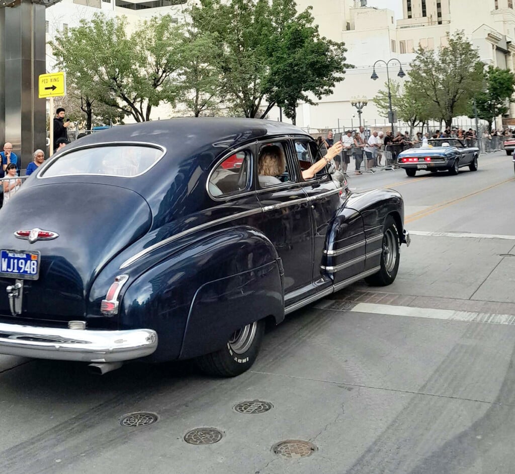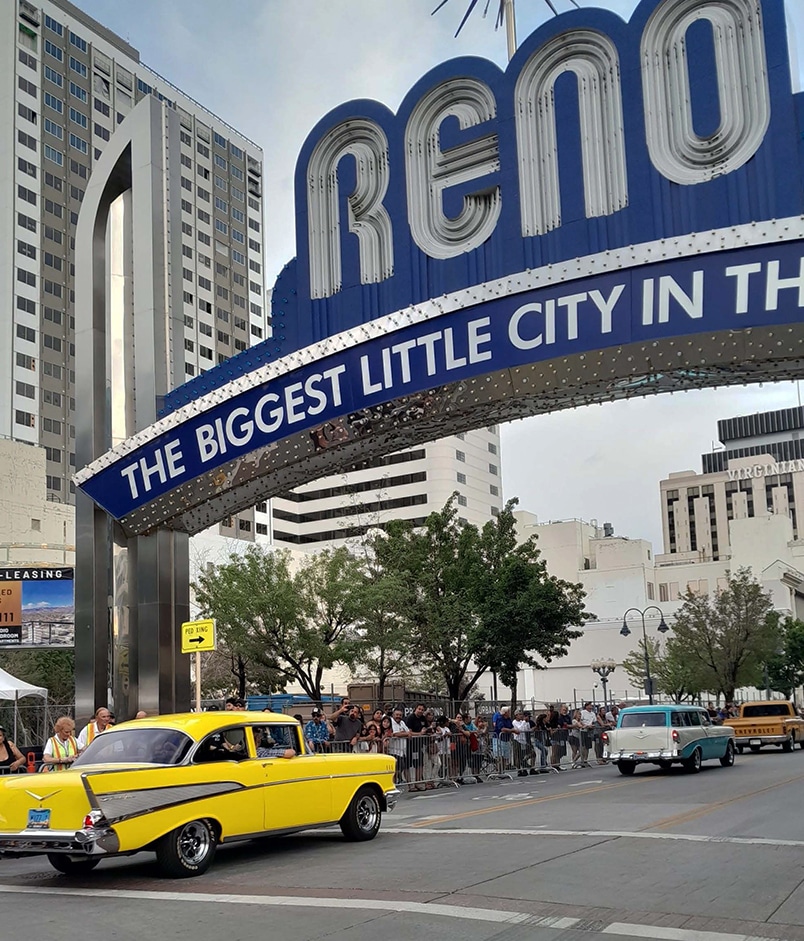 A woman driving in the passenger seat of a vintage convertible, films on her DSLR camera. When they reach the Reno arch she stands and points the camera up at the monument then leans back so she’s laying on the back of the car’s exterior. Her smile is huge.