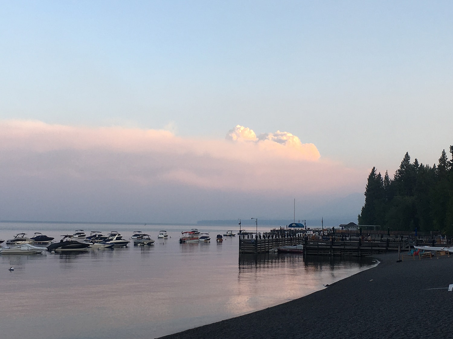 The view from the west side of Lake Tahoe on August 30, 2021. A plume from the approaching Caldor Fire rises above the haze – photo: Tim Hauserman