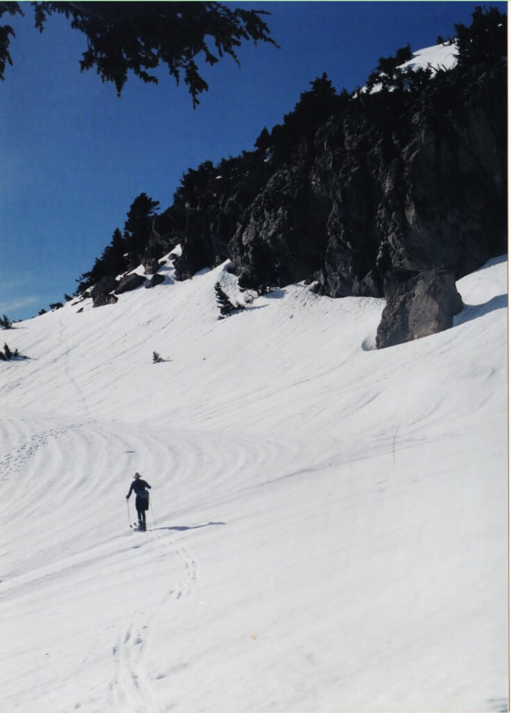 A skier’s dream greeted us: a perfect day, 2,000 vertical feet of virgin powder to descend, and no one else in sight on the mountain. It took us several hours to ascend the 10,457-foot Lassen Peak, a tough workout that earned us a spectacular view of Mt. Shasta and the snow-capped Sierra Nevada range. Next, came the long drop down the mountain’s steep southeast face.