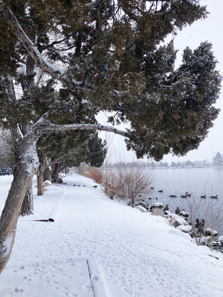 Meanwhile, I felt like I was walking inside a snow globe. The multi-colored houses were lightly dusted like it was powdered sugar and the row of juniper trees had just enough snow to look straight out of every rom com Christmas movie ever made. Even the raucous multitudes of birds that dominate the lake, seemed a bit more subdued then normal, at least for my first two trips around the lake. Although I will say the geese sounded as if they were loudly chattering “freaking snow! Can you believe, it’s freaking snowing!”