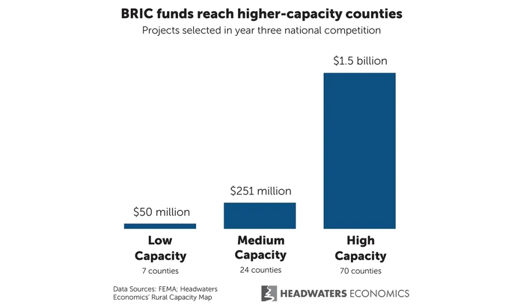 But a rural-urban disparity played out in this year’s BRIC funding, which is paid through an apportionment of the Federal Emergency Management Agency’s (FEMA) disaster relief fund: Only 3% of the counties that received grants are low-capacity, as defined by Headwaters Economics’ Rural Capacity Index.