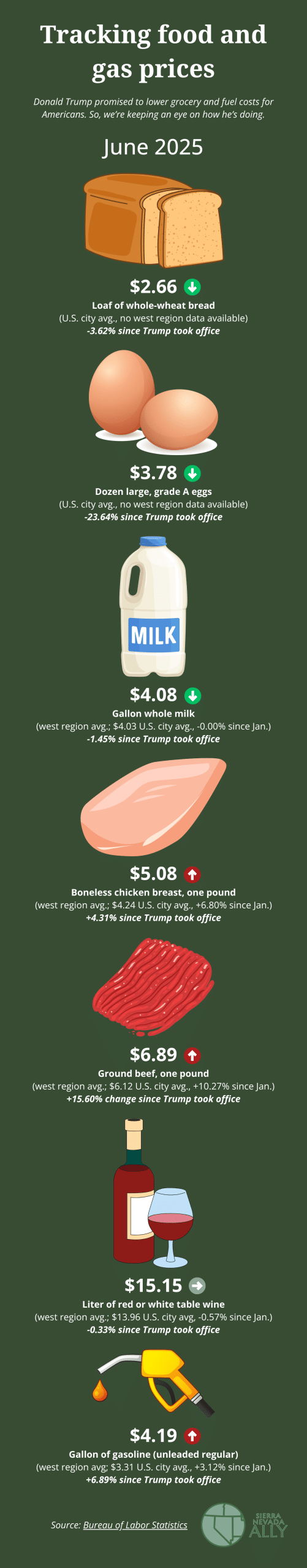 Since Donald Trump took office in late January 2025, we’ve been tracking prices on a few essential grocery items in the West and across the U.S. Every month, the Bureau of Labor Statistics releases the latest set of data on prices, and we’ll be updating this page with the latest information.