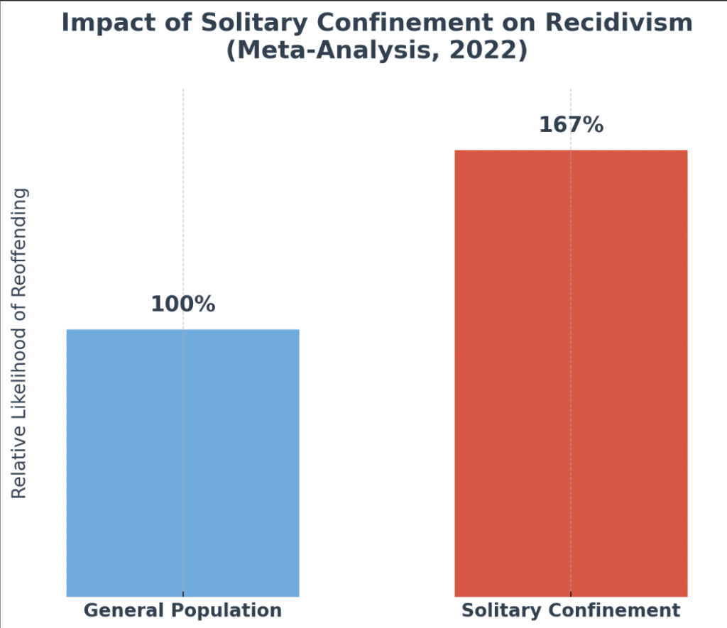 Individuals who experienced solitary confinement are 67% more likely to reoffend than those who did not. Source: 2022 meta-analysis of 194,000 incarcerated adults, National Institutes of Health.