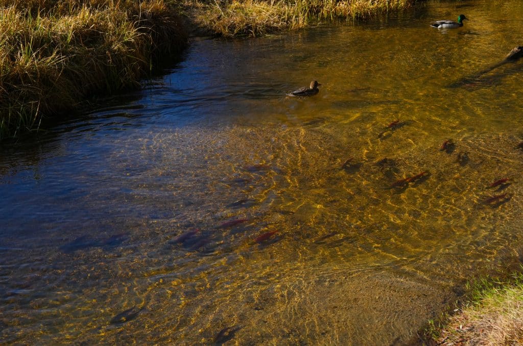 Every fall, the side creeks of Lake Tahoe swell with waves of red, overrun with spawning kokanee salmon who have traveled to these small waterways to lay eggs. As they travel upstream in these creeks from mid to late October or early November, they attract both bears and tourists to witness the spectacle. Recently, the kokanee salmon of Lake Tahoe have been doing just that. Taylor Creek and the Upper Truckee River, both on Lake Tahoe’s South Shore, have been teeming with the fish.